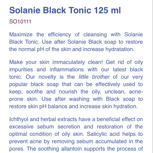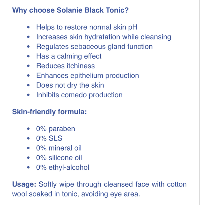Maximize the efficiency of cleansing with Solanie Black Tonic. Use after Solanie Black soap to restore the normal pH of the skin and increase hydratation.
