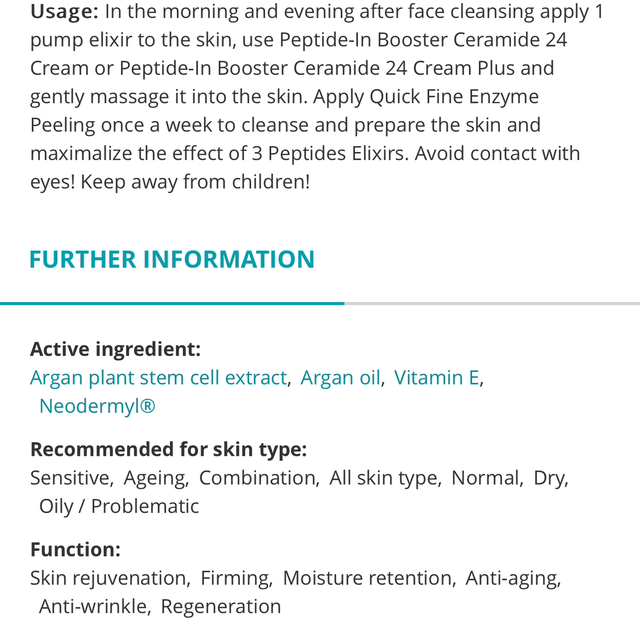 Max Lift elixir with its peptides is one of our best skin tightening products that smooths out even the deep wrinkles and regular application can provide a more elastic and dense skin structure. Neodermyl® and Matrixyl 3000® peptide complex provides needle-free mesotherapy treatment effect: smooth and tight skin, improved skin density. The added hyaluronic acid component has small molecular mass, therefore absorbs easily and deeply into the skin, where it moisturizes the skin from below by bonding with water molecules. The valuable argan plant stem cell extract improves cell regeneration thereby tightens the skin. Regular daily usage can smooth out the wrinkles, improve skin density and elasticity.