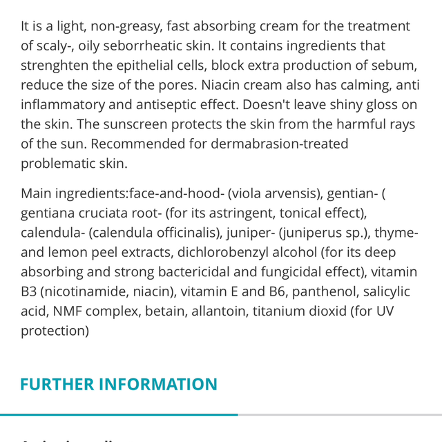 It is a light, non-greasy, fast absorbing cream for the treatment of scaly-, oily seborrheatic skin. It contains ingredients that strenghten the epithelial cells, block extra production of sebum, reduce the size of the pores. Niacin cream also has calming, anti inflammatory and antiseptic effect. Doesn't leave shiny gloss on the skin. The sunscreen protects the skin from the harmful rays of the sun. Recommended for dermabrasion-treated problematic skin.