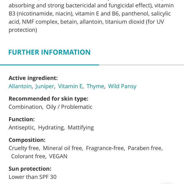 Main ingredients:face-and-hood- (viola arvensis), gentian- ( gentiana cruciata root- (for its astringent, tonical effect), calendula- (calendula officinalis), juniper- (juniperus sp.), thyme- and lemon peel extracts, dichlorobenzyl alcohol (for its deep absorbing and strong bactericidal and fungicidal effect), vitamin B3 (nicotinamide, niacin), vitamin E and B6, panthenol, salicylic acid, NMF complex, betain, allantoin, titanium dioxid (for UV protection)