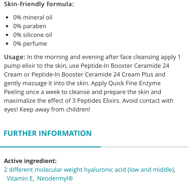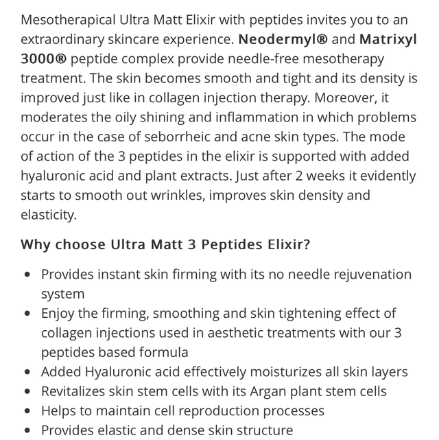 Mesotherapical Ultra Matt Elixir with peptides invites you to an extraordinary skincare experience. Neodermyl® and Matrixyl 3000® peptide complex provide needle-free mesotherapy treatment. The skin becomes smooth and tight and its density is improved just like in collagen injection therapy. Moreover, it moderates the oily shining and inflammation in which problems occur in the case of seborrheic and acne skin types. The mode of action of the 3 peptides in the elixir is supported with added hyaluronic acid and plant extracts. Just after 2 weeks it evidently starts to smooth out wrinkles, improves skin density and elasticity.